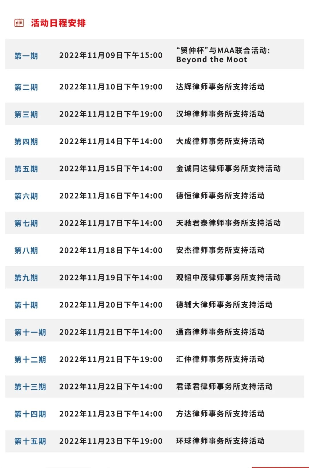 第二十屆“貿(mào)仲杯”國際商事仲裁模擬仲裁庭辯論賽Voice of Moot 系列培訓活動將于2022年11月9日開始,至11月23日結束,共計15期相關活動。“貿(mào)仲杯”辯論賽自2000年舉辦至今已歷經(jīng)十九屆,辯論賽始終秉持培養(yǎng)具備國際化實務能力的涉外仲裁法治人才的初心,匯集了大批國際仲裁法律人才。