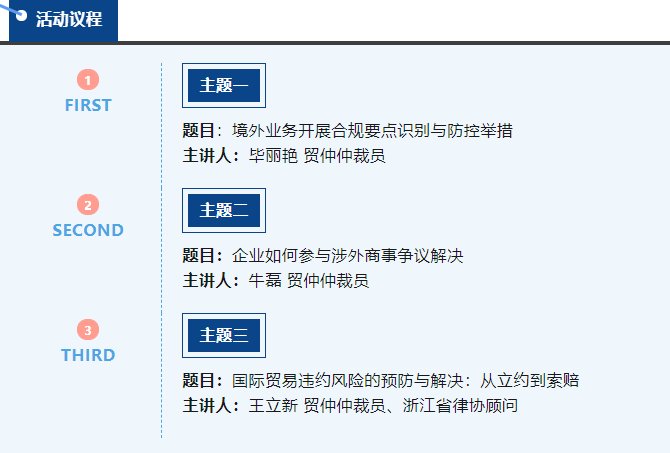 在全球化的商貿(mào)投資環(huán)境中,隨著我國經(jīng)濟(jì)主體“走出去”由量到質(zhì)的發(fā)展方向轉(zhuǎn)變,外向型企業(yè)面臨著日益復(fù)雜和多樣化的合規(guī)需求與法律風(fēng)險,包括跨境貿(mào)易、投資、管制合規(guī)、知識產(chǎn)權(quán)合規(guī)、國際法與外國法合規(guī)、違約風(fēng)險管理等。為幫助企業(yè)加強(qiáng)法律風(fēng)險理解與識別、提高合規(guī)與法律風(fēng)險管理能力,擬在浙江省湖州市舉辦“外向型企業(yè)合規(guī)與法律風(fēng)險管理”研討會。