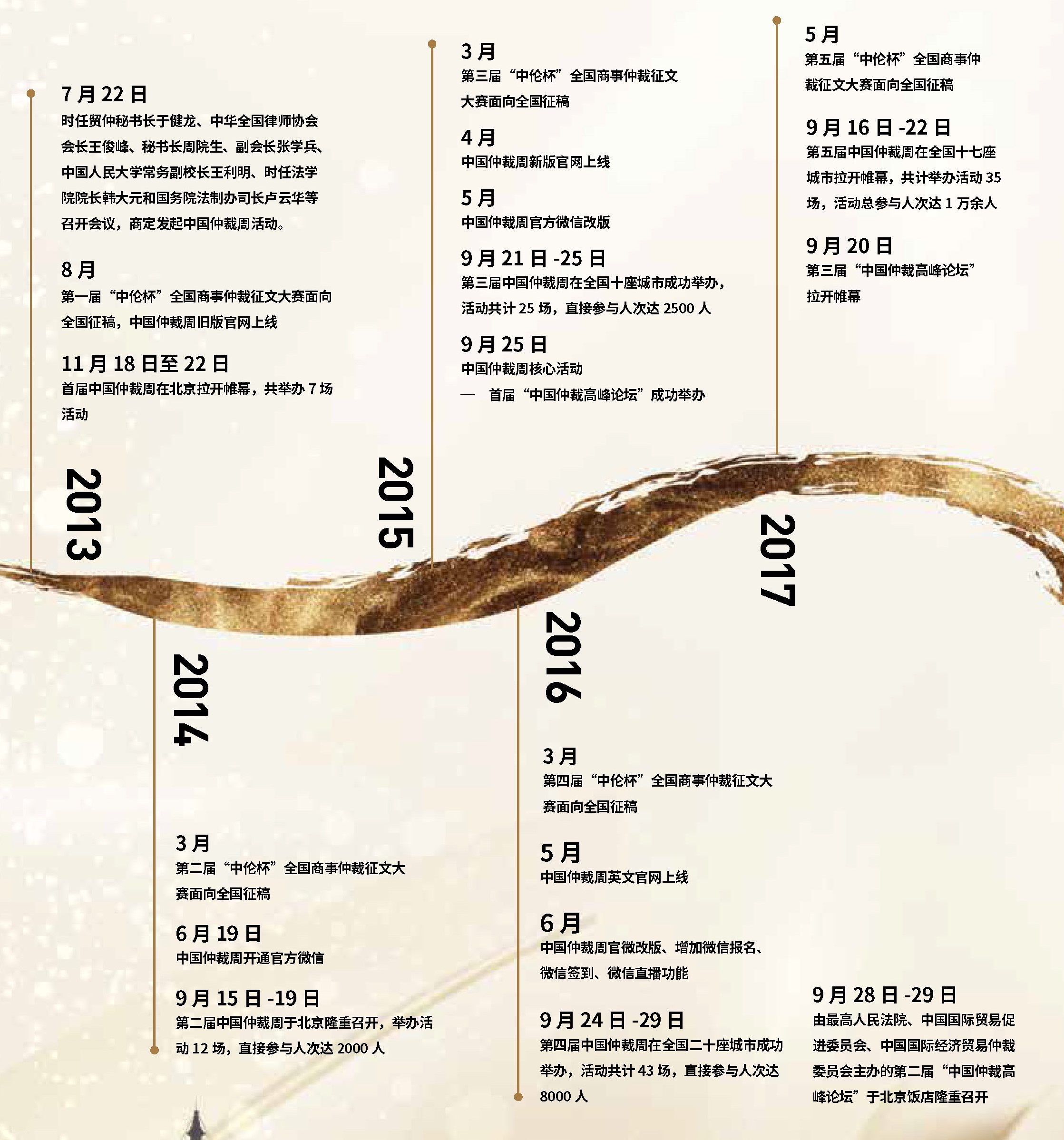 中國仲裁周是中國國際經(jīng)濟貿(mào)易仲裁委員會聯(lián)合中國人民大學(xué)、中華全國律師協(xié)會、北京市律師協(xié)會于2013年共同發(fā)起成立的以仲裁和爭議解決為主題的活動平臺。中國仲裁周系列活動每年在國內(nèi)外數(shù)十座城市同時舉辦,得到社會各界的廣泛認可和積極參與。十年來,中國仲裁周系列活動漸已成為國際上深具影響力的仲裁法律界活動之一。
