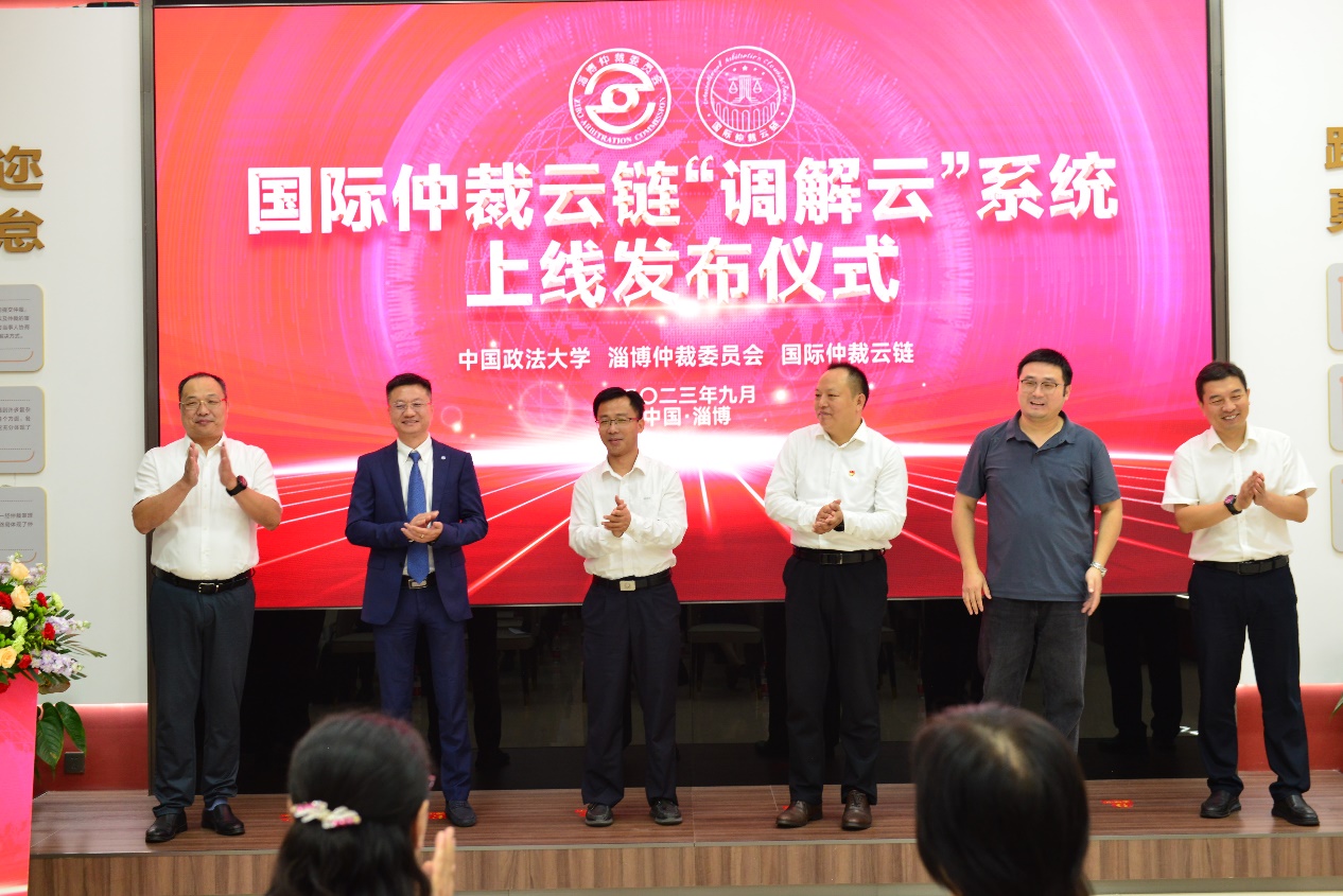 山東省司法廳一級調研員李世敏,淄博仲裁辦黨組書記、主任張公博,淄博仲裁辦黨組成員、副主任閆世學,中國政法大學副教授、國際仲裁云鏈理事會副理事長周蔚,中國政法大學網(wǎng)絡安全和信息化辦公室副主任張軼舸,泰杭律師事務所主任、國際仲裁云鏈理事會理事汪政共同為調解云系統(tǒng)上線揭牌。