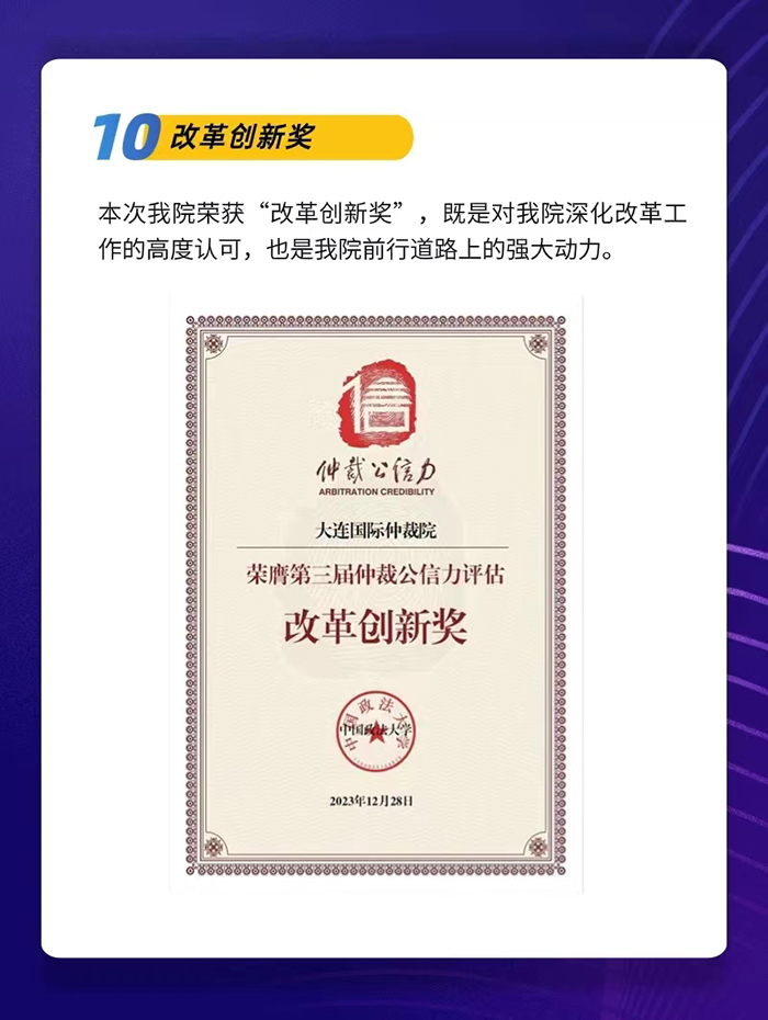 2023年,是大連國(guó)際仲裁院(大連仲裁委員會(huì))順利完成體制機(jī)制改革的第三個(gè)年頭。大連國(guó)際仲裁院堅(jiān)定不移在法治軌道上推進(jìn)大連仲裁發(fā)展體系和能力現(xiàn)代化。全年仲裁業(yè)務(wù)實(shí)現(xiàn)跨越式發(fā)展,辦案質(zhì)效全面提升,公共法律服務(wù)平臺(tái)的輻射面持續(xù)擴(kuò)大,機(jī)構(gòu)品牌的影響力和公信力不斷增強(qiáng)。在推進(jìn)東北亞國(guó)際仲裁中心建設(shè),營(yíng)造優(yōu)質(zhì)的法治化營(yíng)商環(huán)境,擦亮“大連仲裁”的金字招牌上邁出堅(jiān)實(shí)步伐。