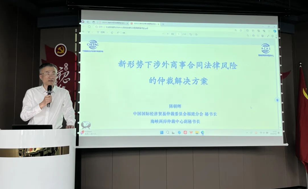 活動中,海峽兩岸仲裁中心副秘書長、中國國際經(jīng)濟貿(mào)易仲裁委員會福建分會秘書長陳朝暉以“新形勢下涉外商事合同法律風(fēng)險的仲裁解決方案”為題,結(jié)合大量實務(wù)案例,幫助企業(yè)了解國際商事合同常見法律風(fēng)險點,并指導(dǎo)企業(yè)靈活運用國際商事仲裁這一涉外商事爭議的有效解決方式。