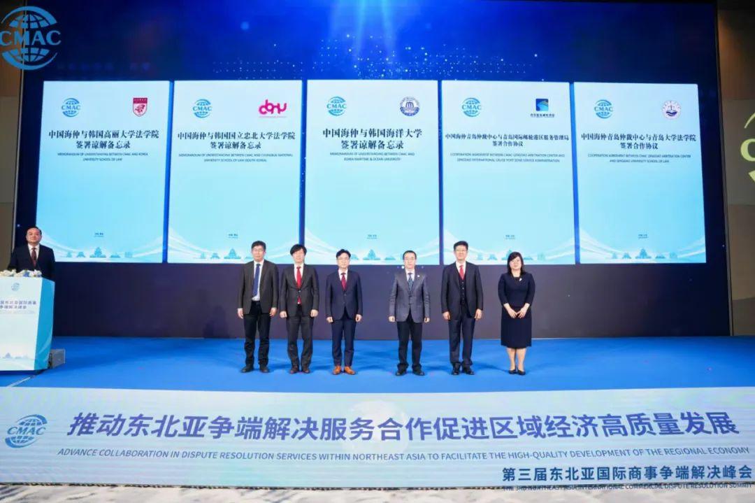 開幕式后,在現(xiàn)場嘉賓見證下,中國海仲分別與韓國海事海洋大學(xué)、韓國高麗大學(xué)法學(xué)院、韓國國立忠北大學(xué)法學(xué)院簽署諒解備忘錄;中國海仲青島仲裁中心分別與青島國際郵輪港區(qū)服務(wù)管理局、青島大學(xué)法學(xué)院簽訂合作協(xié)議。成果發(fā)布環(huán)節(jié)由山東省貿(mào)促會會長孟向東主持。