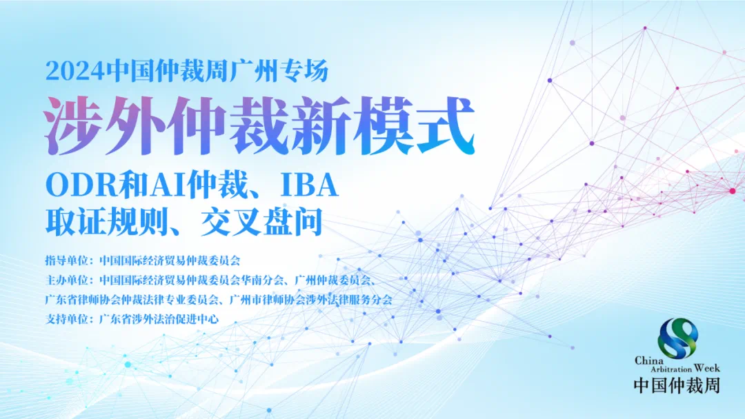 近日,2024中國仲裁周廣州專場活動“涉外仲裁新模式:ODR和AI仲裁、IBA取證規(guī)則、交叉盤問”成功舉辦。本次活動由中國國際經(jīng)濟貿(mào)易仲裁委員會指導,由中國國際經(jīng)濟貿(mào)易仲裁委員會華南分會、廣州仲裁委員會、廣東省律師協(xié)會仲裁法律專業(yè)委員會、廣州市律師協(xié)會涉外法律服務分會共同主辦,并由廣東省涉外法治促進中心支持。