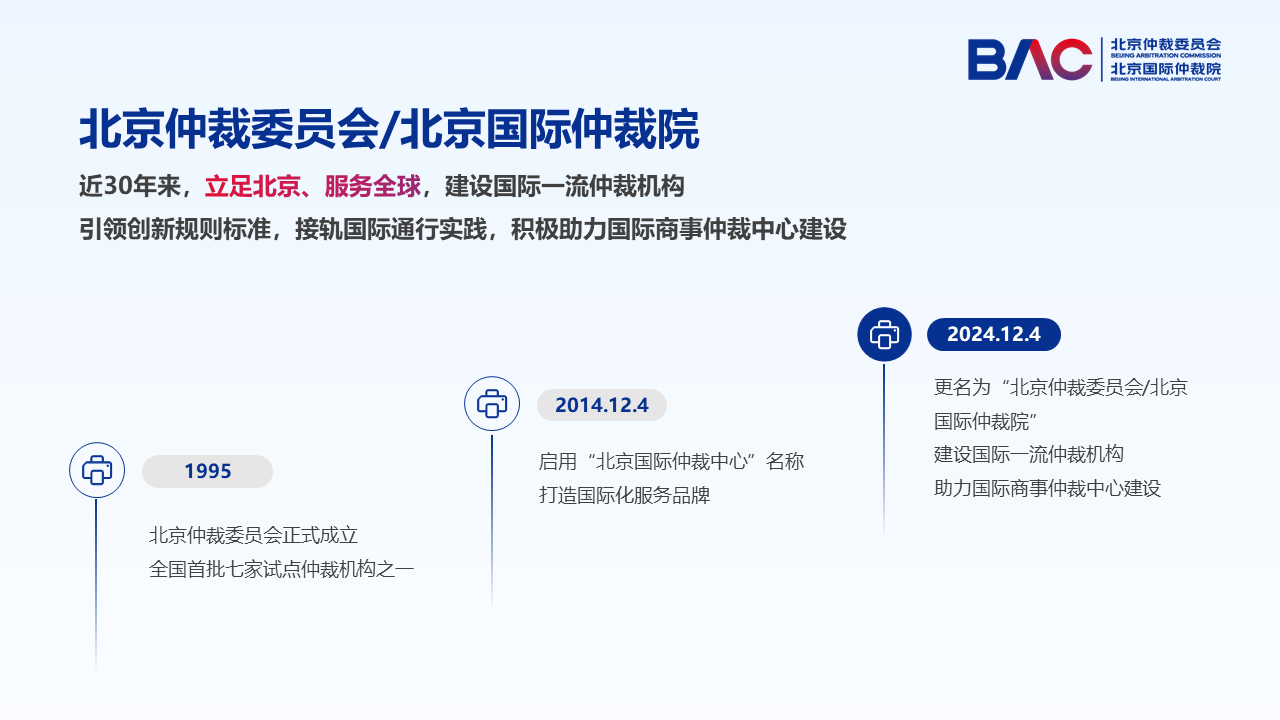 為積極響應中央關于在北京市打造“服務國際科技創(chuàng)新中心與國際交往中心建設的國際商事仲裁中心”的要求,支持國際商事仲裁中心建設,經(jīng)北京市司法局依法變更登記,北仲于2024年12月4日將“北京仲裁委員會/北京國際仲裁中心”的名稱變更為“北京仲裁委員會/北京國際仲裁院”。