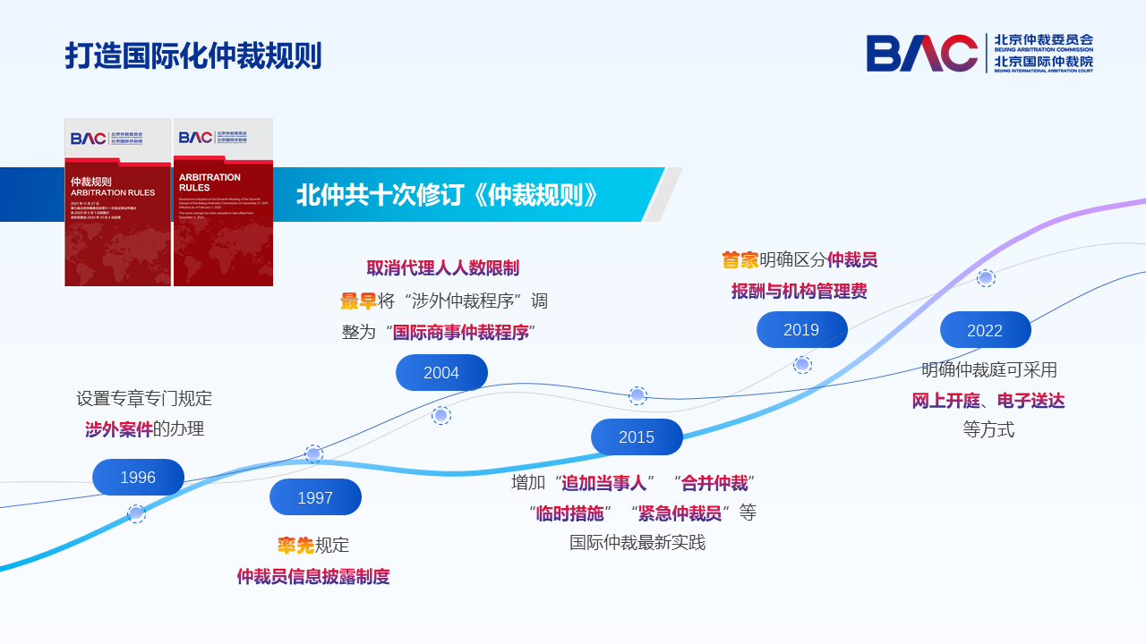 成立至今,北仲共計十次修訂《仲裁規(guī)則》。歷次修訂均緊跟國際仲裁先進實踐,廣受國內(nèi)外關注,已成為仲裁規(guī)則修訂完善的行業(yè)引領者。