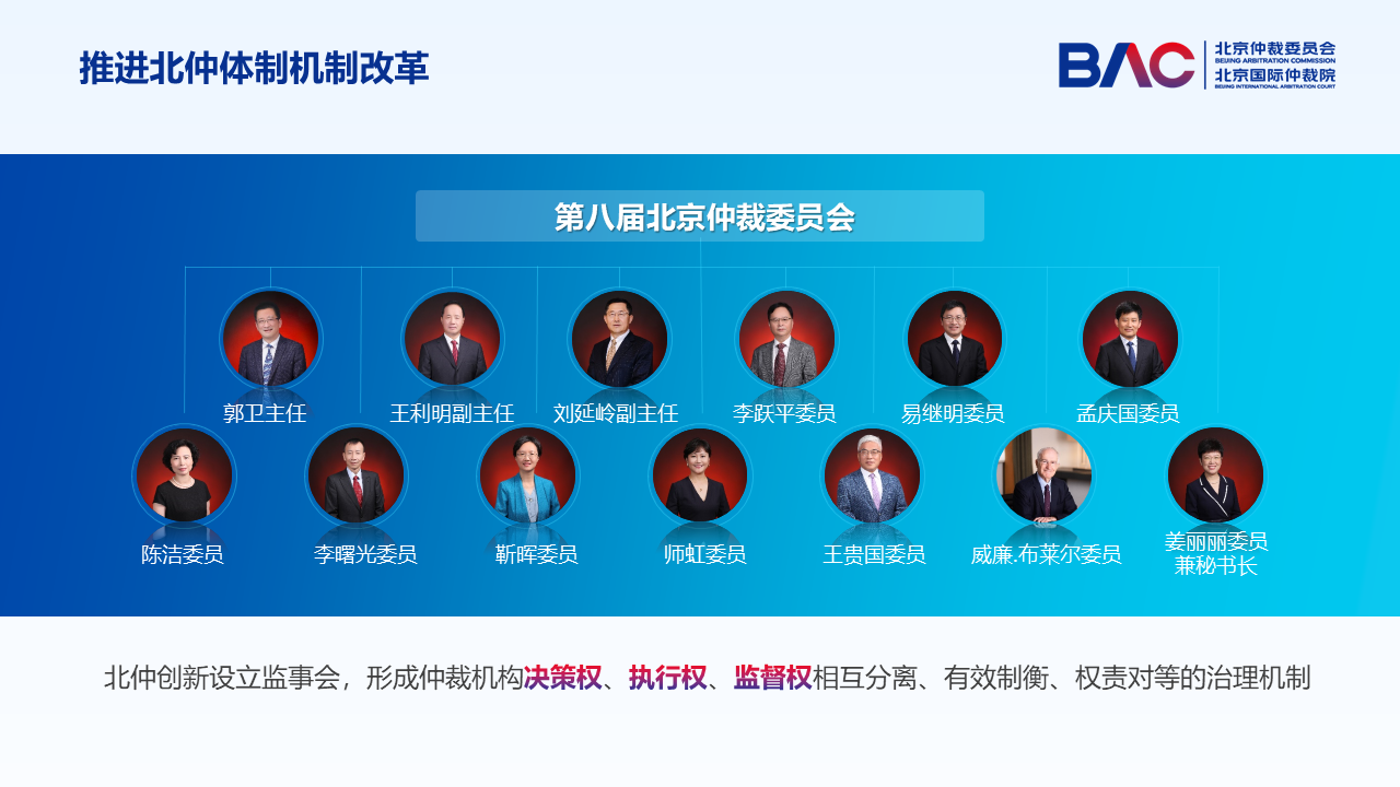 據(jù)介紹,北仲本輪體制機(jī)制改革是以第八屆仲裁委員會換屆為標(biāo)志的。2023年9月,由13位在法律、金融、數(shù)字經(jīng)濟(jì)、知識產(chǎn)權(quán)、國際商事爭議解決等領(lǐng)域的資深專家組成的第八屆北仲委員會成立,其中包括兩名境外專業(yè)人士。同時,北仲創(chuàng)新設(shè)立了監(jiān)事會作為實體運(yùn)行的監(jiān)督機(jī)構(gòu),與秘書局共同形成了仲裁機(jī)構(gòu)決策權(quán)、執(zhí)行權(quán)、監(jiān)督權(quán)相互分離、有效制衡、權(quán)責(zé)對等的法人治理機(jī)制。