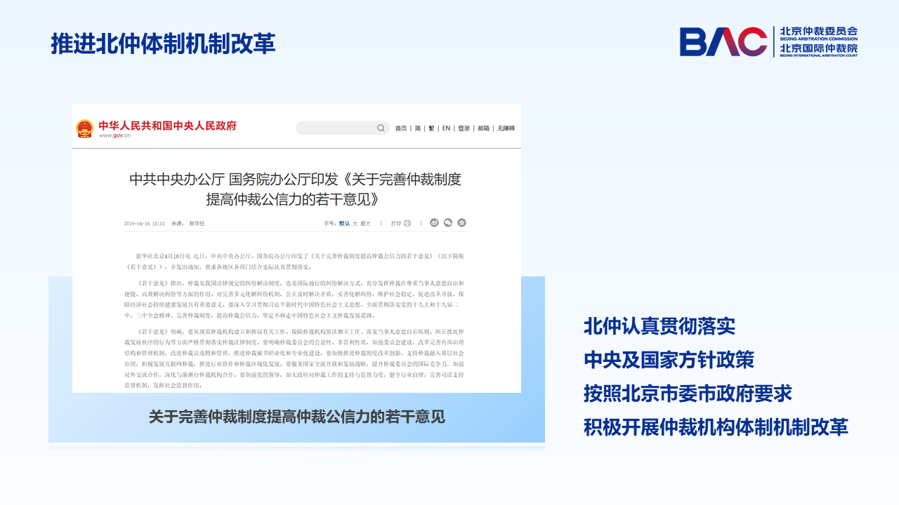 為了打造國際一流的仲裁機(jī)構(gòu)以支撐國際商事仲裁中心建設(shè),北仲認(rèn)真貫徹落實中央及國家方針政策,按照北京市委市政府要求積極開展仲裁機(jī)構(gòu)體制機(jī)制改革。