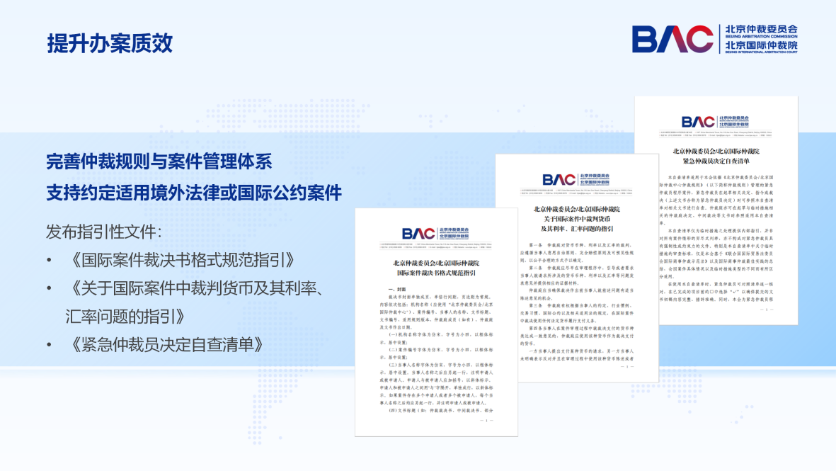 近五年來,北仲處理了大量約定適用境外法律或國際公約,以及以外語為仲裁語言的案件,具備處理復(fù)雜國際商事爭議的全球化思維及豐富的經(jīng)驗(yàn),能夠滿足境內(nèi)外當(dāng)事人的多元爭議解決需求。北仲還發(fā)布了與國際主流實(shí)踐接軌的指引性文件并在實(shí)踐中廣泛適用,比如發(fā)布了《國際案件裁決書格式規(guī)范指引》《關(guān)于國際案件中裁判貨幣及其利率、匯率問題的指引》《緊急仲裁員決定自查清單》等。