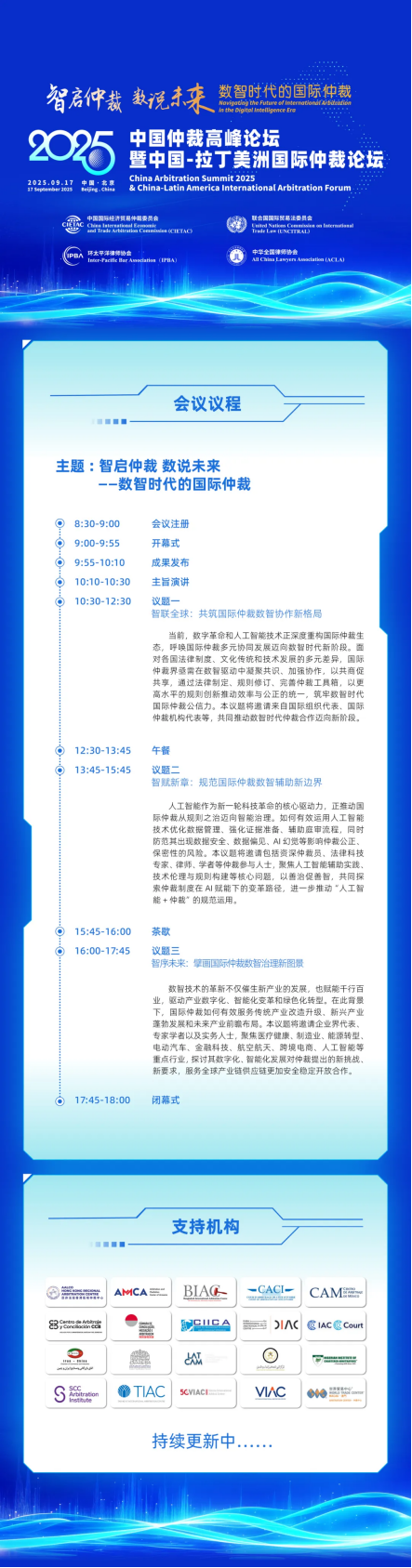 由中國國際經濟貿易仲裁委員會(CIETAC)、聯(lián)合國國際貿易法委員會(UNCITRAL)、環(huán)太平洋律師協(xié)會(IPBA)以及中華全國律師協(xié)會(ACLA)聯(lián)合舉辦的2025中國仲裁高峰論壇暨中國-拉丁美洲國際仲裁論壇將于2025年9月17日在北京舉辦。