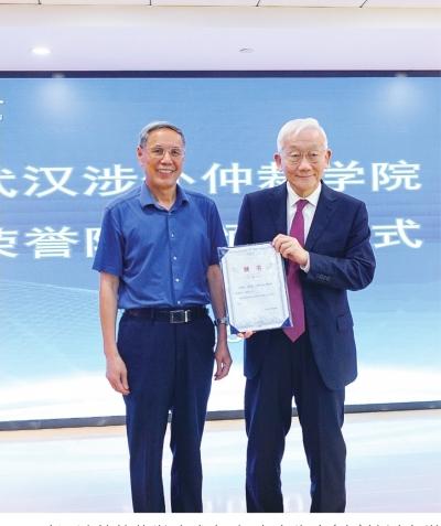 武漢涉外仲裁學(xué)院成立,楊良宜先生(右)接過名譽(yù)院長(zhǎng)聘書。