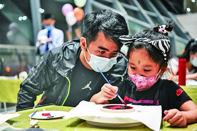 成都博物館,家長帶小朋友在夜間體驗(yàn)成都漆器制作。新華社發(fā)