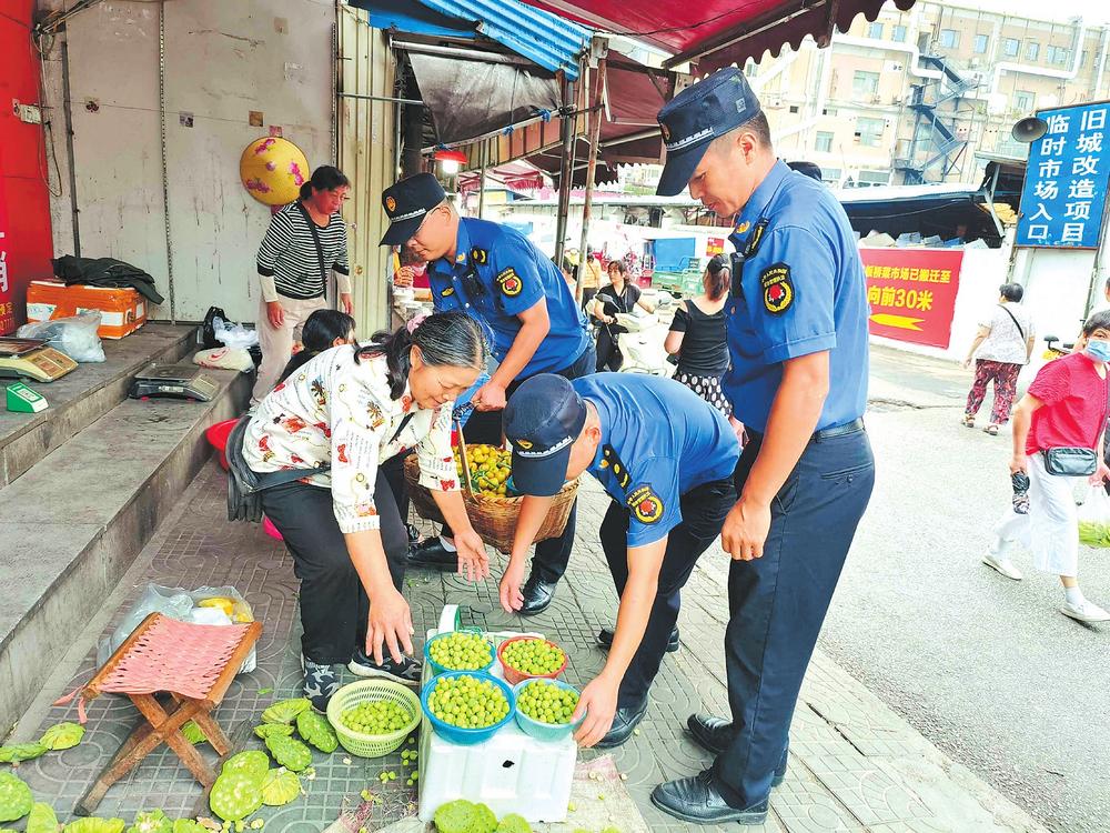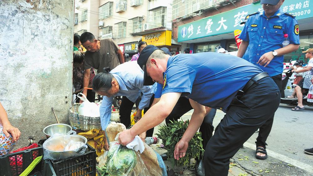 “我們采取延時(shí)、錯(cuò)時(shí),定人、定崗、定責(zé)的工作機(jī)制,安排執(zhí)法隊(duì)員錯(cuò)時(shí)對(duì)農(nóng)貿(mào)市場(chǎng)周邊及臨街門店開展逐一檢查,堅(jiān)決杜絕部分商戶、流動(dòng)攤販出店經(jīng)營、占道經(jīng)營和擺放遮陽傘阻擋過道等行為?!痹诮瘗樎繁眰?cè)花板橋菜市場(chǎng)及花鳥路周邊,區(qū)城管局五里牌中隊(duì)通過采用錯(cuò)時(shí)執(zhí)法和取締一批、歸市一批、疏導(dǎo)一批的辦法,在花鳥路附近的南北樓設(shè)立臨時(shí)疏導(dǎo)區(qū),為自產(chǎn)自銷的菜農(nóng)創(chuàng)造合法的經(jīng)營地點(diǎn),通過耐心宣傳相關(guān)政策規(guī)定,主動(dòng)幫助商戶搬移占道物品等文明執(zhí)法方式,工作得到廣大商戶和流動(dòng)攤販的理解及市場(chǎng)周邊百姓的支持。