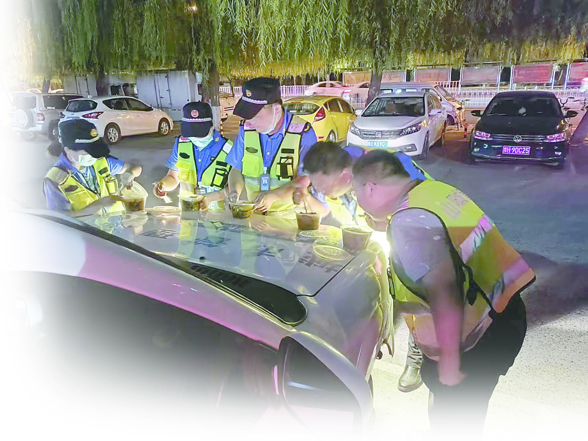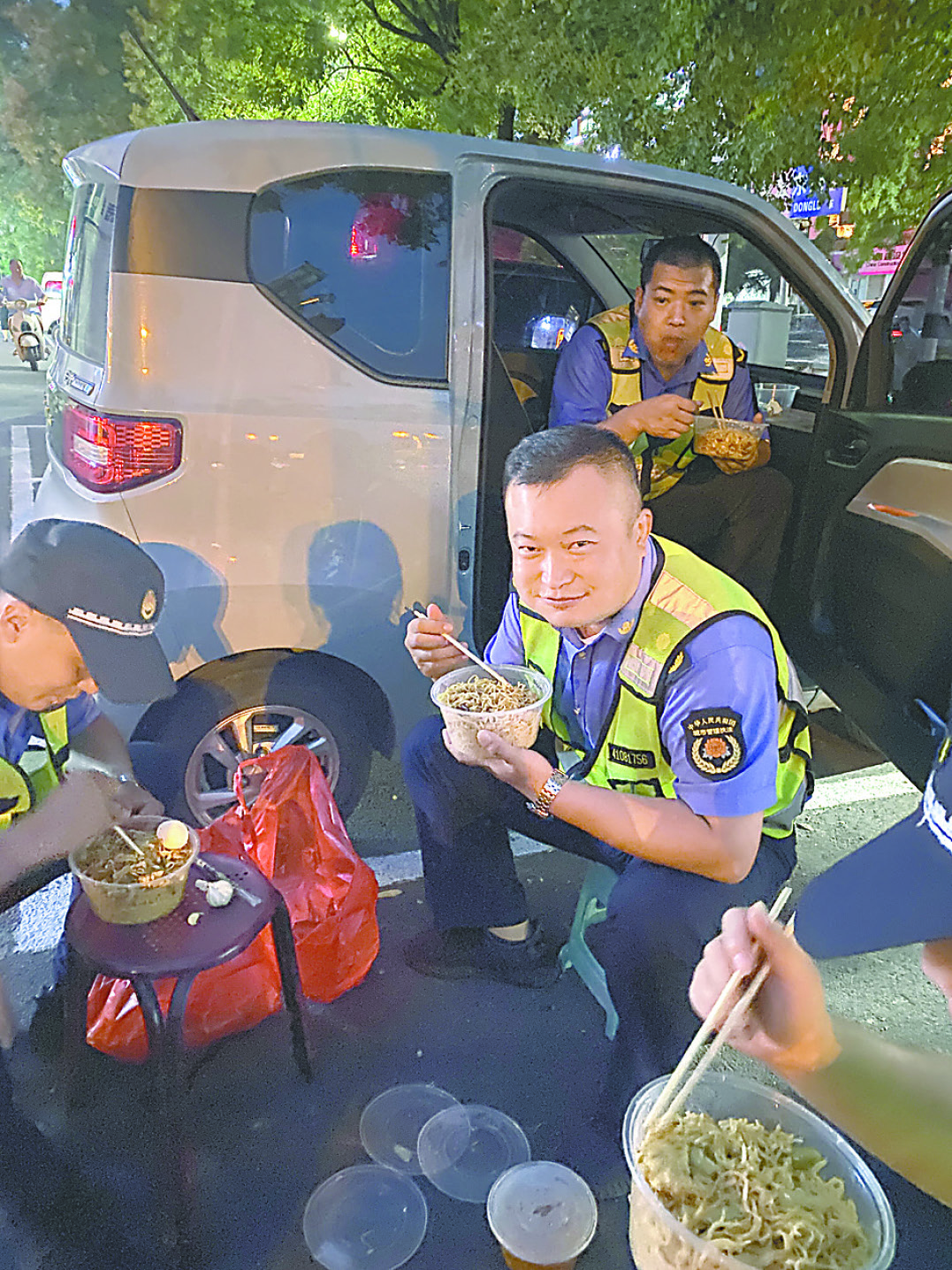 圖④ 山陽區(qū)城管局執(zhí)法三中隊隊員用車頭當臨時“餐桌”,夜色下燈光很美,但他們就餐的姿勢更美。