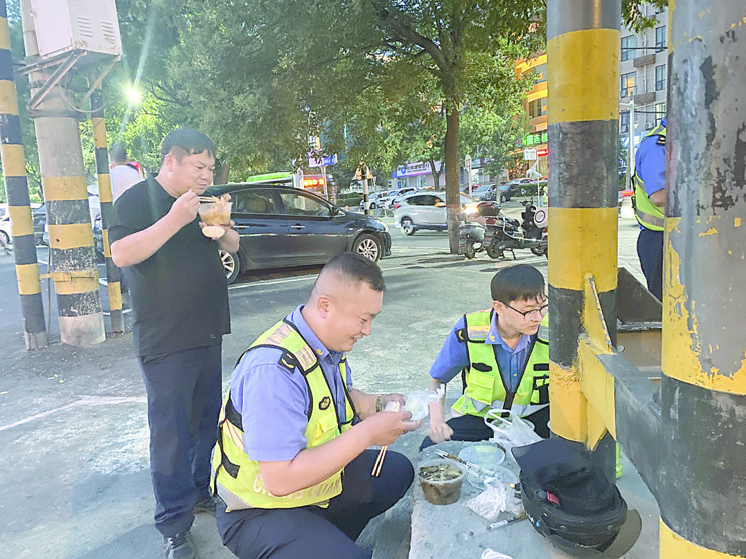 圖③ 山陽區(qū)城管局執(zhí)法一大隊三中隊孫玉新(中)吃著加班餐,疲憊的臉上依然擋不住對工作的熱愛。