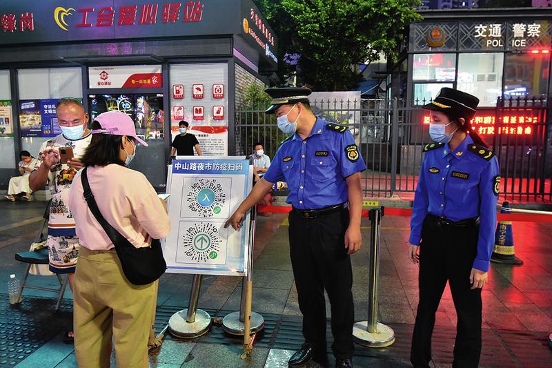 ▲城管執(zhí)法隊(duì)員在中山路夜市巡查提醒市民掃碼做好疫情防控