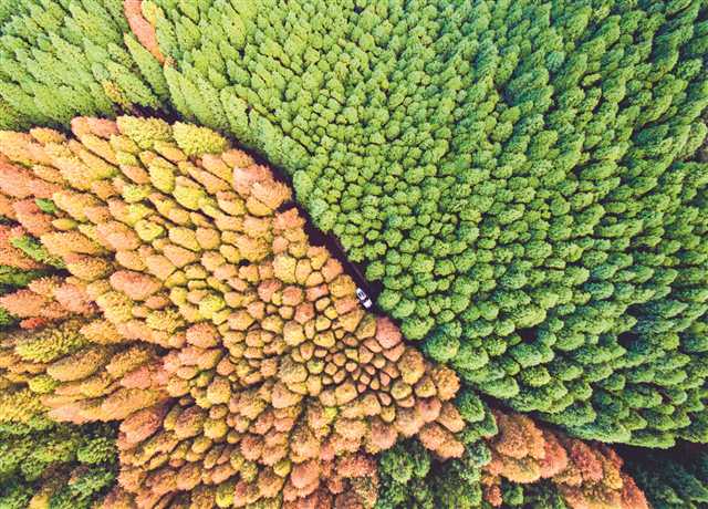 圖4:山王坪喀斯特國(guó)家生態(tài)公園實(shí)施石漠化治理,依托地形種植水杉和柳杉,在秋季形成了“春秋同框”的彩林景觀。攝/汪新