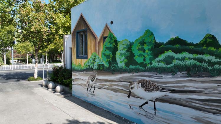這邊公廁外立面粉刷一新,那邊墻面彩繪美輪美奐。在廣場路公廁西面墻上,一幅栩栩如生的勺嘴鷸墻面畫吸引不少市民駐足觀看。該墻面畫長9米、寬4.5米,含濕地、勺嘴鷸、森林、小木屋等東臺(tái)元素,描繪出一對“小勺子”在條子泥濕地自由覓食的生動(dòng)景象,展現(xiàn)了人與自然和諧共生的美好圖景?!霸趯?shí)際作畫過程中發(fā)現(xiàn)墻面有個(gè)窗戶,通過構(gòu)思把窗戶融合到畫面中的小木屋里去了?!崩L畫老師朱進(jìn)華告訴記者,物畫融合也是這幅畫的亮點(diǎn)之一。