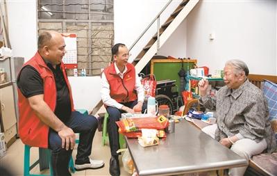 郭耀全(左)和楊學智(中)夜訪民情,來到榕桂街看望郭婆婆。(記者 莊小龍 攝)