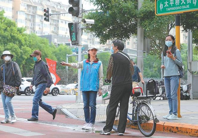 “現(xiàn)在是紅燈,請您站在白線外稍作等候?!眮碜员本┦锥紕?chuàng)業(yè)集團有限公司和東直門街道東外大街社區(qū)的8名青年志愿者正在有序引導(dǎo)過往行人。