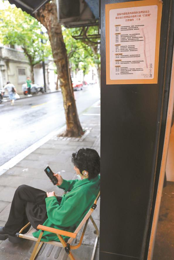 走在這條路上,你會注意到,不少店鋪都將圍墻向里退界,借墻體“擠”出幾個戶外卡座;你也會注意到,很多商戶墻上,貼著“門責(zé)制”自律規(guī)約二十條,對衛(wèi)生、安全和規(guī)范經(jīng)營等作出承諾。政府部門希望,通過“最小治理單元”的自治,引導(dǎo)商戶管理好自家“一畝三分田”,并增加商戶今后對于街區(qū)各項(xiàng)事務(wù)的參與感和話事權(quán)。