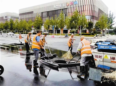 為應(yīng)對此次強(qiáng)降雨,天津市環(huán)衛(wèi)部門16000名環(huán)衛(wèi)工人奮戰(zhàn)在第一線,753部作業(yè)車輛全部在崗,及時對城市環(huán)境進(jìn)行清整作業(yè),保障市民安全出行。圖為河西區(qū)環(huán)衛(wèi)工在樂園道等區(qū)域排水。 記者 龐劍 攝