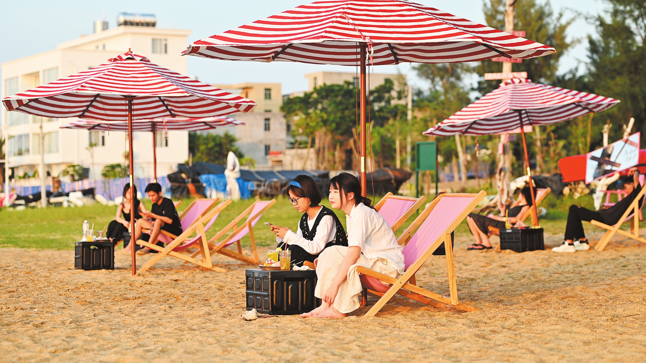10月6日,在秀英區(qū)榮山寮村,市民游客在沙灘上樂享假日慢生活。記者 石中華 攝