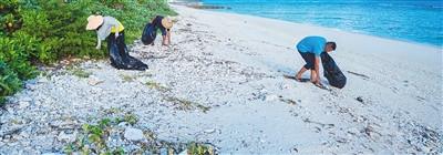 在三沙北島,居民在沙灘上撿拾廢棄塑料等垃圾。 阮琛 攝