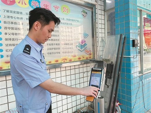 南寧市公安局交警支隊(duì)科研所民警展示“碼上回家·預(yù)約小精靈”小程序,用二維碼掃一掃智能機(jī)器即可向家長發(fā)送離校信息。