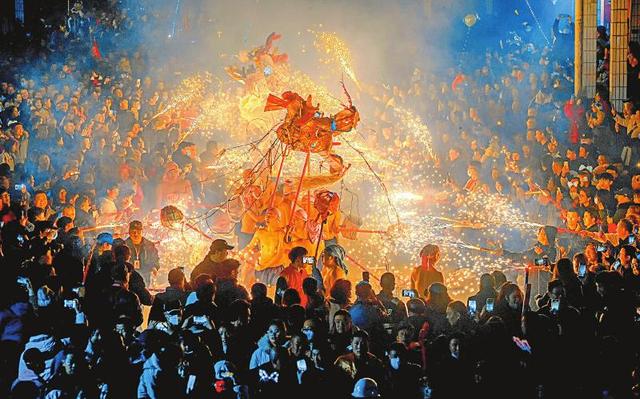 樂(lè)加火龍 綿陽(yáng)三臺(tái)縣樂(lè)加火龍鬧元宵。燒火龍是當(dāng)?shù)貍鹘y(tǒng)民俗,老百姓認(rèn)為煙火燃得越旺,來(lái)年的日子就越紅火。