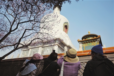 3月18日,北海公園,白塔下盛開(kāi)的山桃花。記者 薛珺 攝