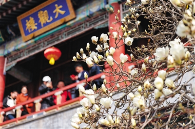3月18日,北京大觀(guān)園,大觀(guān)樓前玉蘭綻放。記者 王飛 攝
