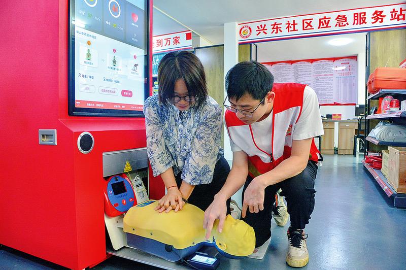 在興東社區(qū)應(yīng)急服務(wù)站,廣西安全生產(chǎn)科學(xué)研究院的工作人員利用心肺復(fù)蘇急救培訓(xùn)一體機(jī)開展示范教學(xué),并邀請居民實(shí)操訓(xùn)練。記者 黃維業(yè) 攝