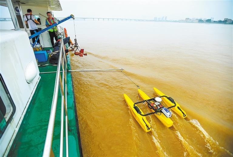6月19日,江西省樟樹市水文水資源監(jiān)測大隊(duì)隊(duì)員利用走航式ADCP進(jìn)行流量測驗(yàn),為及時(shí)發(fā)布洪水預(yù)警提供科學(xué)依據(jù)。周亮 攝(中經(jīng)視覺)
