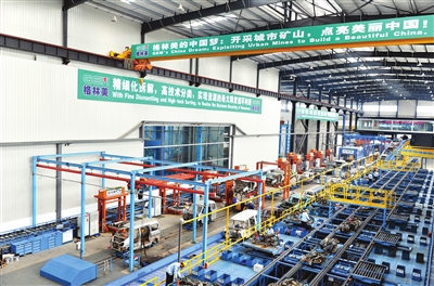 在這里,一輛報廢汽車被送上流水線,僅15分鐘就從整車變?yōu)樗槠F扑楹蟮臍堅杆龠M(jìn)入分選流水線,自動分類回收銅、鋁、塑料等材料,經(jīng)專業(yè)化處理可節(jié)能六成、節(jié)材七成,為下游企業(yè)提供低耗能、低排放、高效率的資源保障。