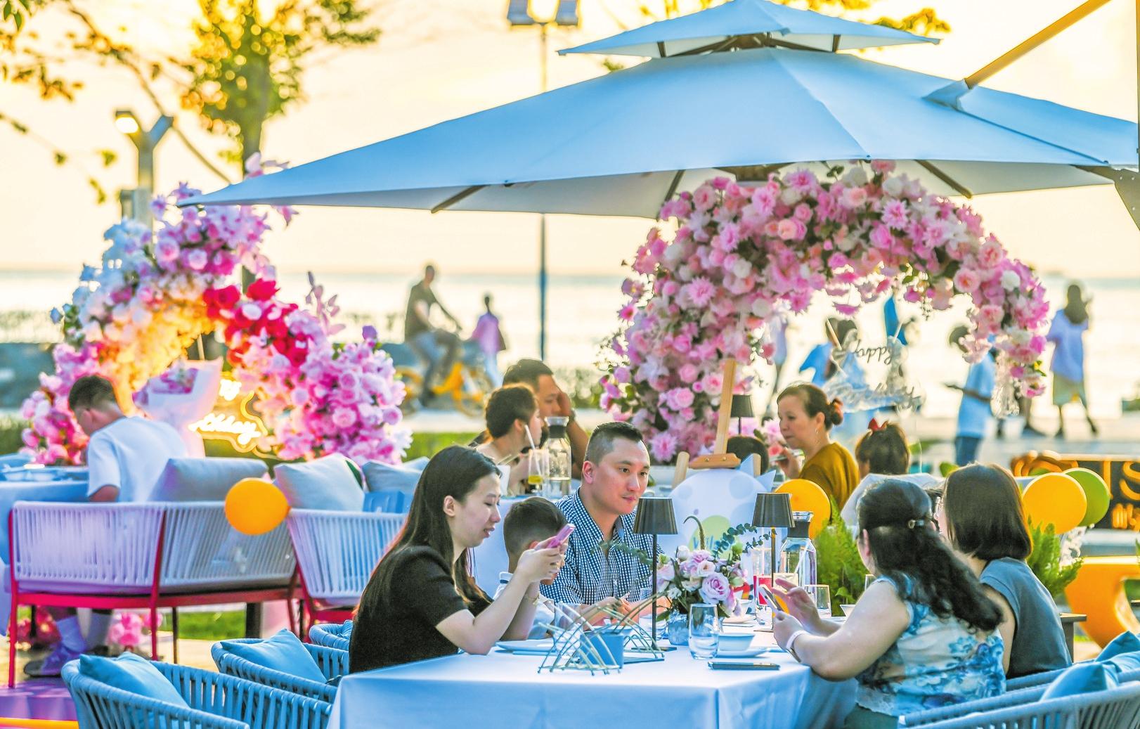 近日,走進位于龍華區(qū)的??贔UNBAY自在灣商業(yè)街區(qū),記者看到已有不少品牌入駐。據(jù)介紹,該街區(qū)計劃于年內(nèi)正式開街,規(guī)劃有包括餐飲、娛樂、復合零售等在內(nèi)的多個業(yè)態(tài)。在IS PARTY嶼海之約餐廳酒吧,露天區(qū)域被鮮艷的花束裝點得十分浪漫,食客們在其中傾聽音樂、享用美食?!拔覀兛粗泻?跒车膮^(qū)位優(yōu)勢,希望通過提供濱海消費場景,為海口增添活力感和時尚感?!痹摬蛷d酒吧店長王李平介紹。