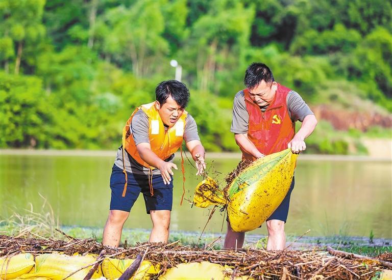 7月28日,福建省南安市金淘鎮(zhèn)毓南村躍進水庫,當(dāng)?shù)攸h員干部在搬運溢洪道的沙袋,全力保障轄區(qū)群眾生命財產(chǎn)安全。謝貴明攝(中經(jīng)視覺)