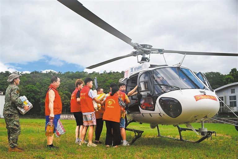 7月30日,湖南省資興市第一中學(xué)球場,志愿者在運送物資,“黨員先鋒號”直升機趕赴多個村組進行空投。郭立亮攝(中經(jīng)視覺)