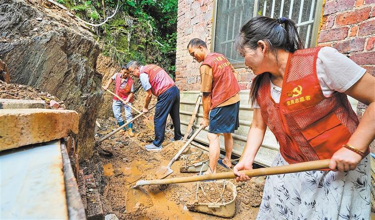 7月29日,江西省萍鄉(xiāng)市湘東區(qū)廣寒寨鄉(xiāng)官陂村黨員志愿者幫助村民清理房屋旁的落石和淤泥。李桂東攝(中經(jīng)視覺)