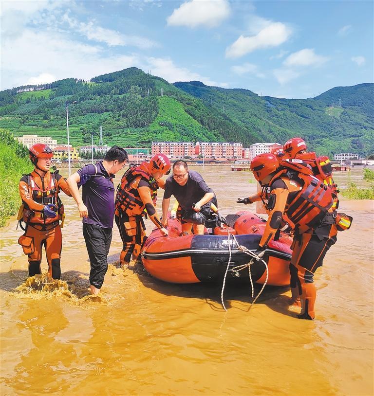 7月29日,吉林省臨江市建國街道居民小區(qū),臨江市消防救援大隊黨員干部為受困居民運送物資并轉(zhuǎn)移受困群眾。申文力攝(中經(jīng)視覺)