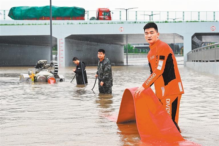 7月30日,山西省運城市應(yīng)急救援大隊全體黨員干部堅守一線,操作龍吸水設(shè)備進行排水工作,確保居民出行安全。常奇攝(中經(jīng)視覺)