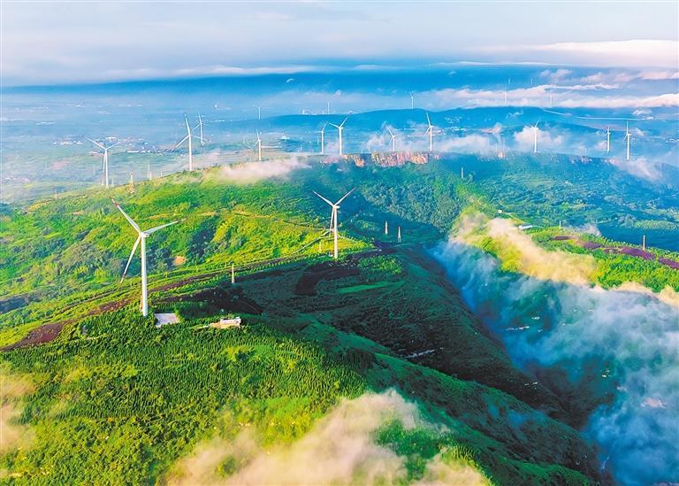 8月6日,河南省宜陽(yáng)縣錦屏山生態(tài)園,滿山翠綠映襯著一臺(tái)臺(tái)新能源風(fēng)力發(fā)電機(jī)。該縣立足生態(tài)優(yōu)先、綠色發(fā)展理念,建造了27000畝人造森林公園,把昔日荒山打造成可持續(xù)循環(huán)發(fā)展的綠色經(jīng)濟(jì)帶。田義偉 攝(中經(jīng)視覺)