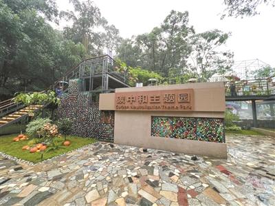 在新桐木和茄子樹旁,園區(qū)利用“廢品”打造綠色低碳創(chuàng)意場(chǎng)景,使用廢棄塑料瓶搭建“勺嘴鷸”藝術(shù)墻、廢棄地磚鋪砌科普展館建筑外表面、園藝工具剪刀設(shè)計(jì)成“魚躍龍門”等,為整個(gè)碳中和主題園增添了不少意趣??稍偕茉捶矫?,園內(nèi)科普展館等建筑物屋頂裝有分布式光伏發(fā)電板,借助智能化能源轉(zhuǎn)換系統(tǒng),以清潔能源為園內(nèi)照明系統(tǒng)等進(jìn)行供電。資源循環(huán)利用方面,中水回用展示水池采用目前國(guó)內(nèi)領(lǐng)先的水處理技術(shù),將園區(qū)廢水和收集的雨水處理達(dá)標(biāo)后,用于園區(qū)植物灌溉,減少水資源使用;園林垃圾資源化處理為塑料替代材料,制成鍋碗瓢盆、餐具、掛鐘、砧板等生活用品;以園林綠化廢棄物資源化處理產(chǎn)物——有機(jī)基質(zhì)作為原材料,結(jié)合廣府文化,設(shè)計(jì)開發(fā)“黑金”手環(huán)等文創(chuàng)產(chǎn)品。