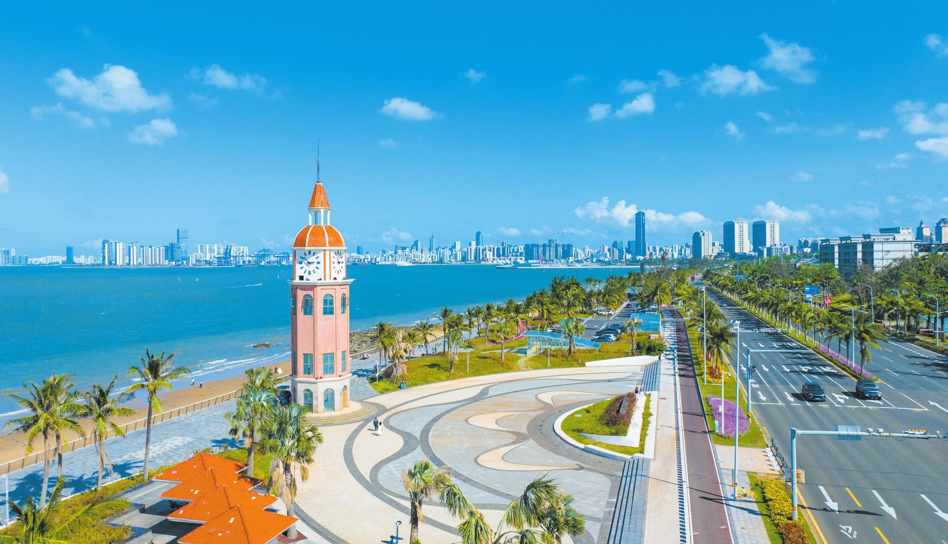 圖為10月20日,遠(yuǎn)眺濱海大道,水天相接,岸邊的沙灘、鐘樓、椰林融為一體,相映成趣,椰城海口的濱海美景一覽無遺。記者 楊忠凱 攝