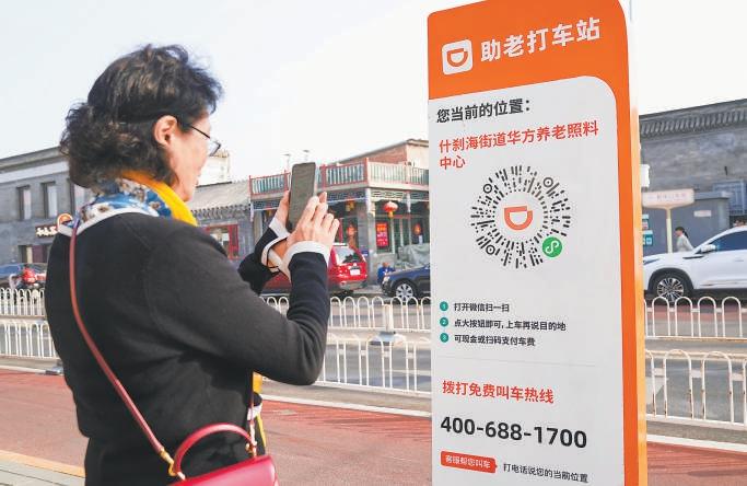 老年人通過(guò)助老打車(chē)站標(biāo)識(shí)牌方便快捷叫車(chē)。