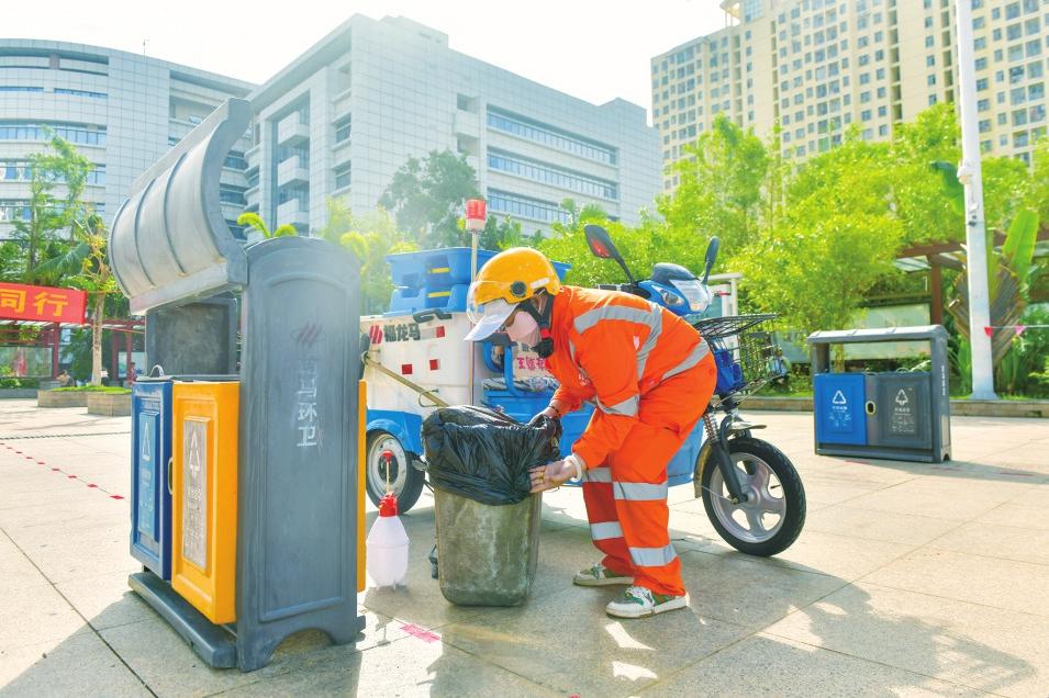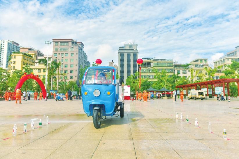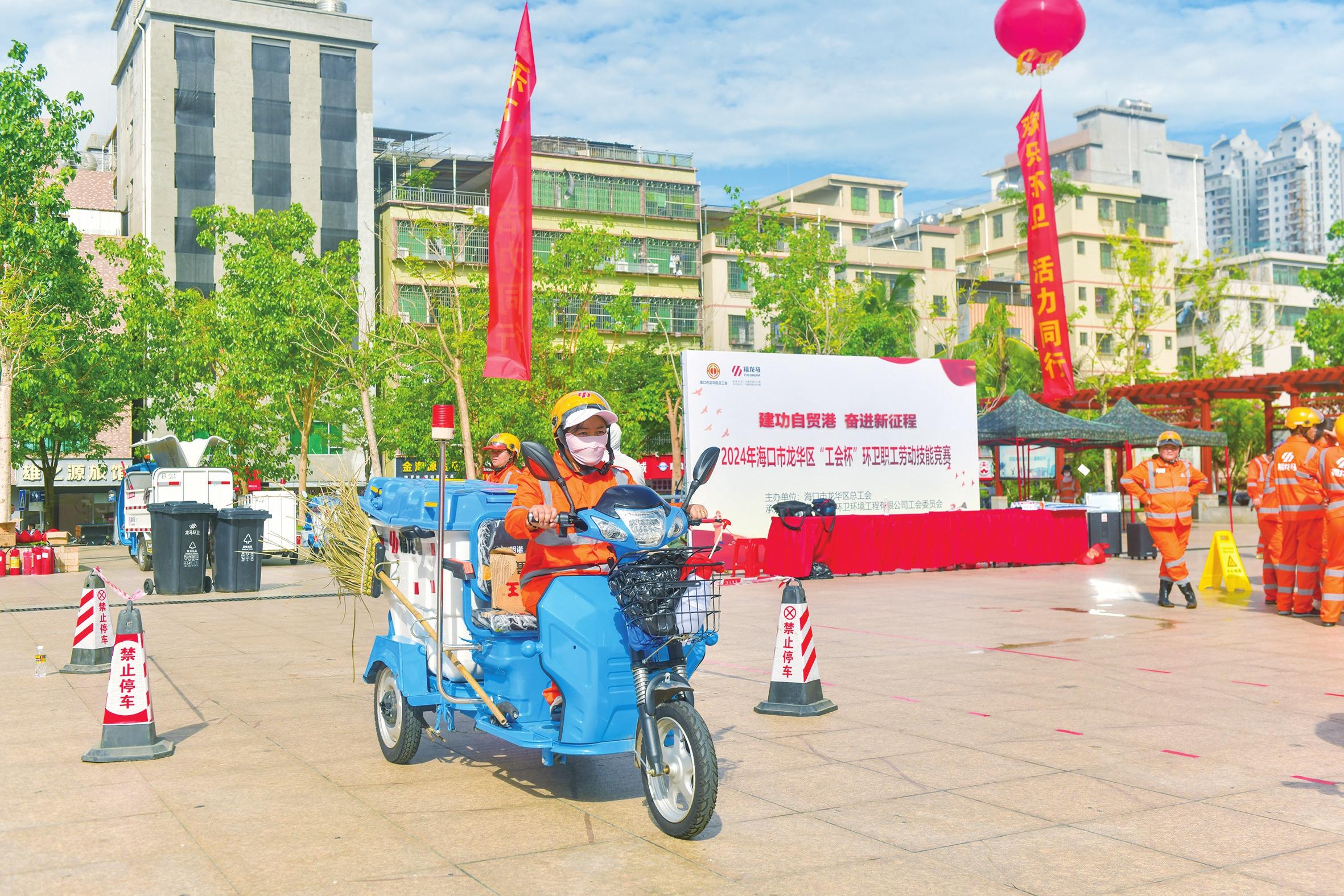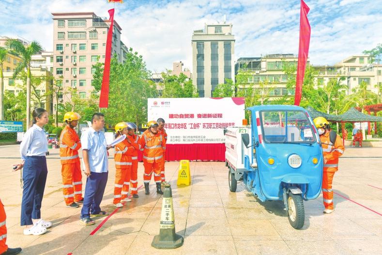 10月18日,??谑旋埲A區(qū)雙創(chuàng)廣場上熱鬧非凡,福龍馬??诠窘倜h(huán)衛(wèi)工人在進(jìn)行技能比賽。他們激情四射,將自己最好的狀態(tài)、精湛的技術(shù)展現(xiàn),贏得了陣陣歡呼。