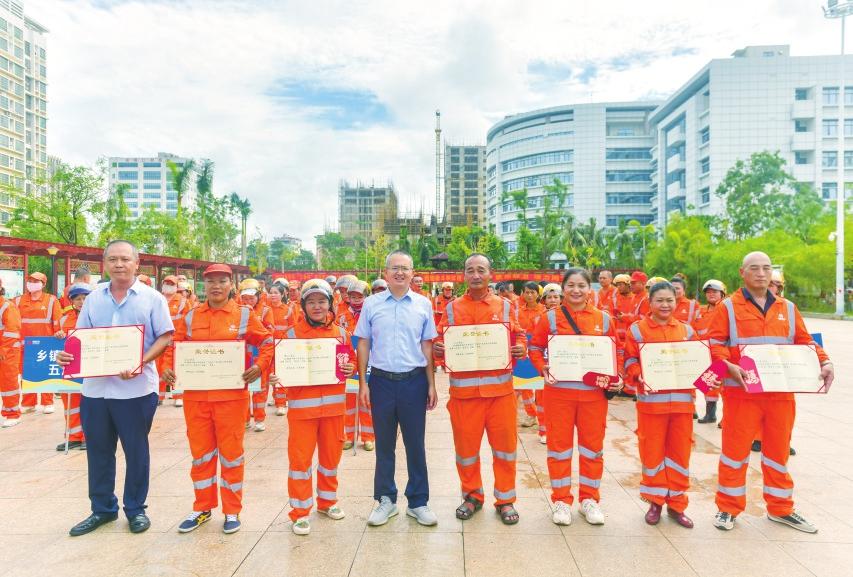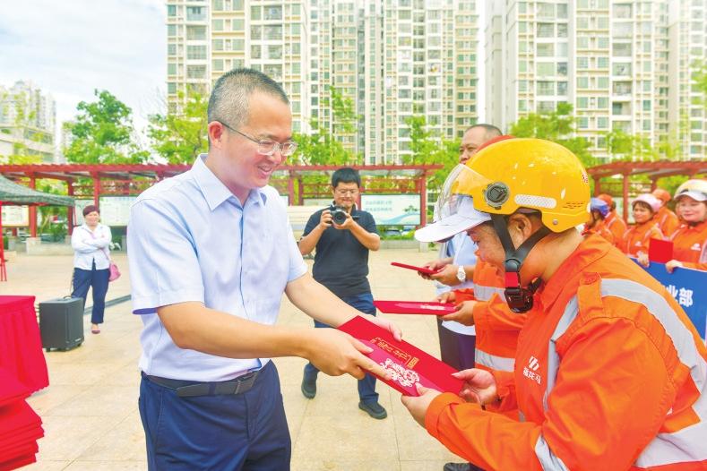 龍華區(qū)總工會黨組成員、副主席林勝雄,龍華區(qū)環(huán)衛(wèi)局副局長符嬌燕,福龍馬海口公司總經(jīng)理黃彪、副總經(jīng)理邢益芳、楊志剛出席,向?yàn)槌鞘忻利愋燎诟冻龅沫h(huán)衛(wèi)工人們加油打氣,并致以誠摯的感謝和節(jié)日的祝賀。