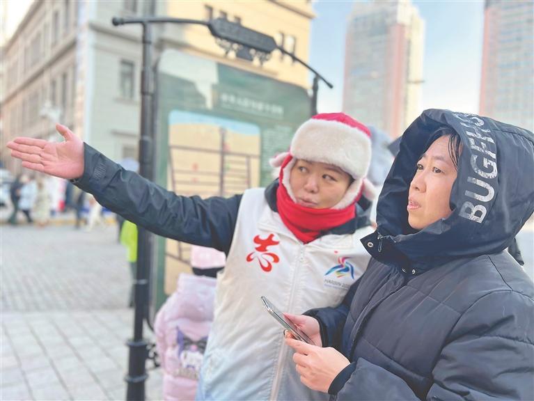 2月4日,農(nóng)歷正月初七。在位于哈爾濱市道里區(qū)中央大街與西十五道街交口處的志愿者服務(wù)站,亞冬會(huì)城市側(cè)志愿者張琦正忙著為有需求的游客服務(wù)。