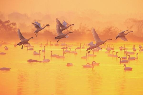 晨霧中,小天鵝舒展修長(zhǎng)脖頸,在水面上優(yōu)雅起舞。來(lái)自西伯利亞的小天鵝連續(xù)5年來(lái)到岳陽(yáng)市屈原管理區(qū)“打卡”,數(shù)量從1000多只增加到3000多只。