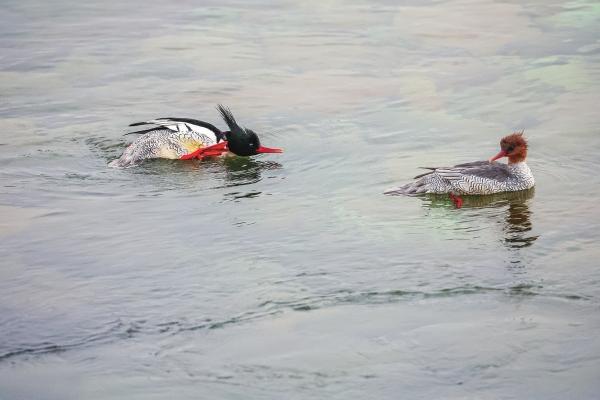 2月8日,桃源水電站大壩下方淺灘水域,國(guó)家一級(jí)保護(hù)動(dòng)物中華秋沙鴨在梳理羽毛。